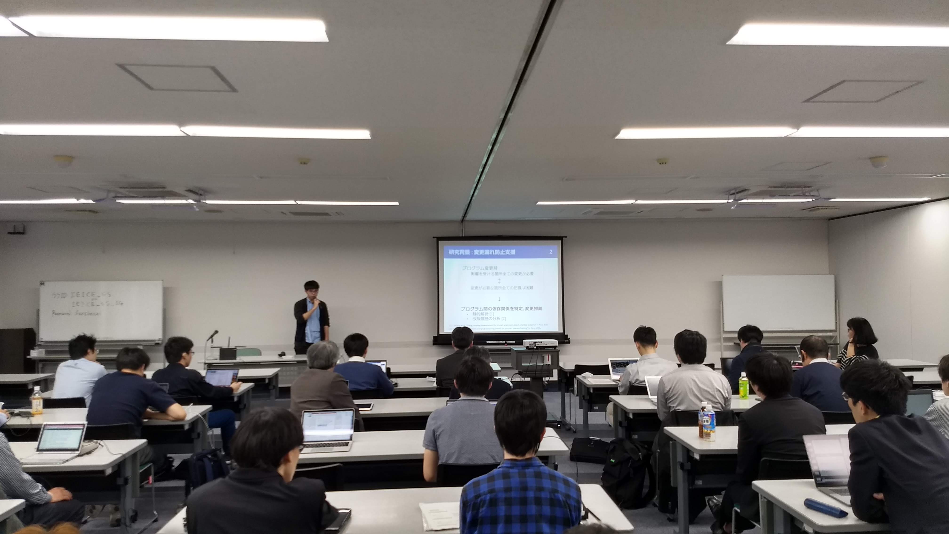 小林研 B4の石田義八さん,小林准教授が、沖縄県の那覇で開催されたIEICE ソフトウェアサイエンス研究会 3月研究会にて、石田さんの学士論文の成果をもとにした研究発表を行いました。頻繁に同時編集されるファイルを共変更ルールとして抽出することでファイルの変更漏れを指摘する既存手法にルール集約手法を組み合わせることで推薦制度の向上を図る手法を提案しています.