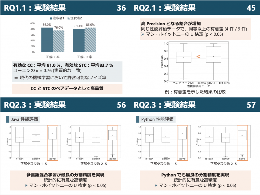 JavaとPythonによる評価の結果,本手法はベンチマークの手法による分割精度を超えたことに加え,未学習の言語に対しても高い分割精度を維持できることを確認した.両言語を混合して学習した場合には,単一の言語のみで学習した場合を上回る最良の精度 (Java: 0.782, Python: 0.775) を記録した.この結果は,複数の言語を同時に学習することで,異なる言語間に共通する本質的な構造的特徴をモデルが捉えたことを意味する.