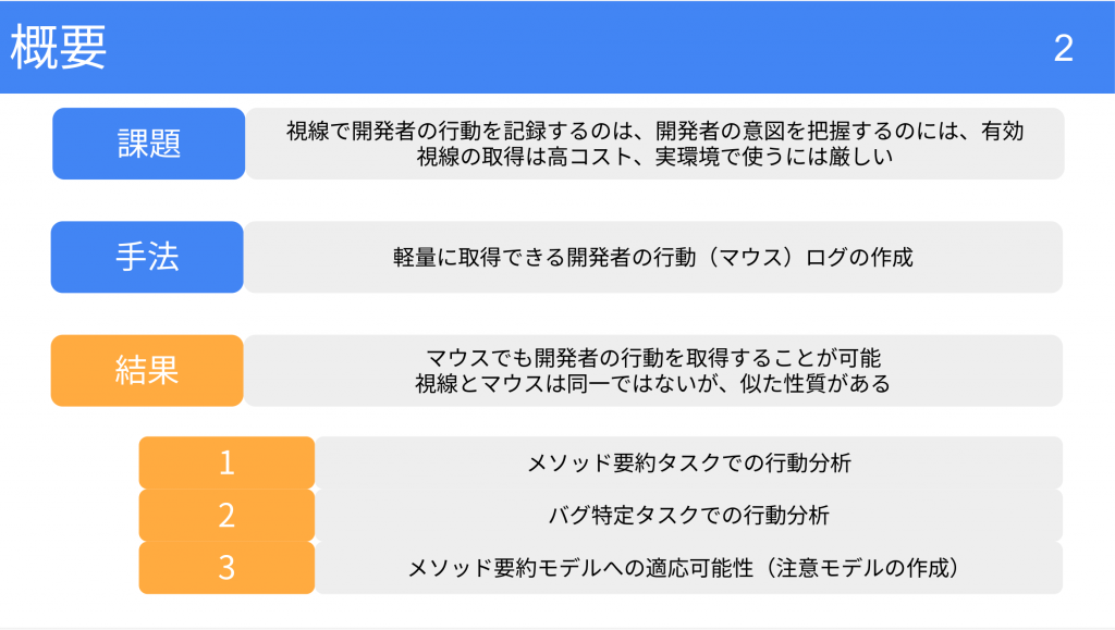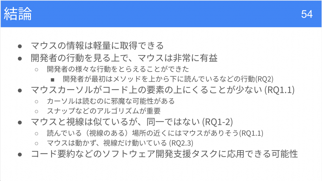 以上より,マウス・IDEログは,視線の完全な代替ではないが,開発者の注意配分や探索の一部を低コストに捉える手段として有望である.トークン割当ての失敗やスナップへの依存,変数追跡のような局所的読解の感度差などが課題として残るものの、メソッド要約モデルへの組み込みなどソフトウェア開発支援への展開が期待できると結論づける。